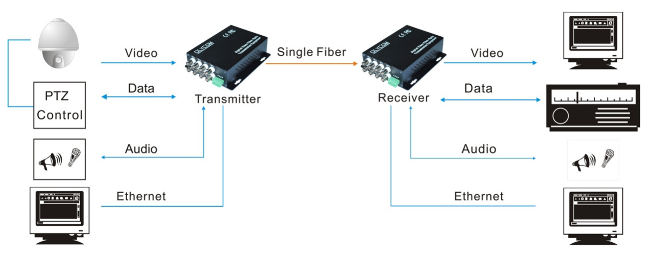| OM610-2V↑2D↓2A↑1E WT/R | 2ch video Tx + 2ch RS485 data Rx + 2ch audio Tx + 1ch 10/100M Ethernet |